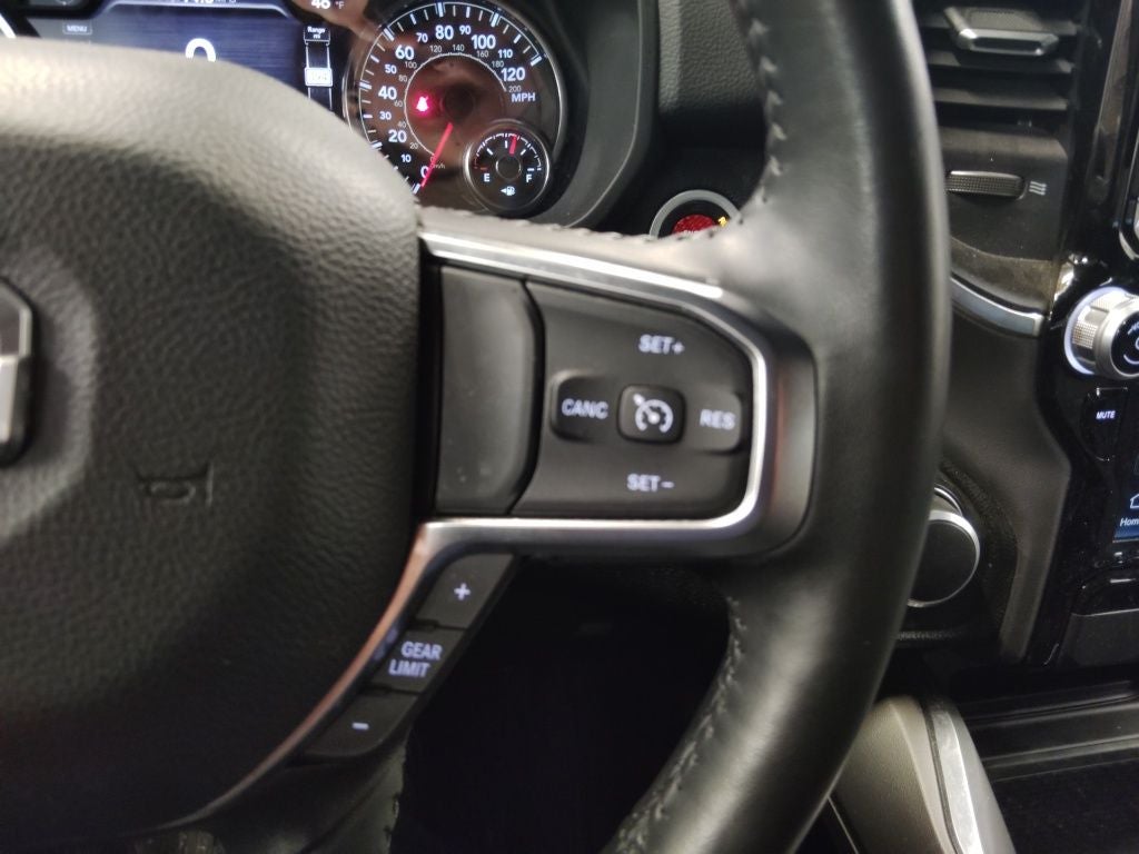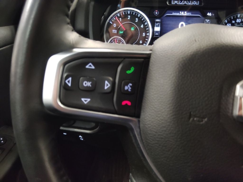 Handsfree Phone and Audio, Ready–Alert Braking, Rain–Brake Support, Rear Under–Seat Storage Compartment, 1500 Big Horn/Lone Star, 4D Crew Cab, 3.6L V6 24V VVT, 8-Speed Automatic, 4WD, Diamond Black Crystal Pearlcoat, Black Cloth, 115V Auxiliary Power Outlet, 4G LTE Wi-Fi Hot Spot, 9 Amplified Speakers w/Subwoofer, Air Conditioning ATC w/Dual Zone Control, Anti-Spin Differential Rear Axle, Apple CarPlay, Auto-Dimming Exterior Driver Mirror, Auto-Dimming Rear-View Mirror, Bed Utility Group, Big Horn Level B Equipment Group, Bluetooth® Handsfree Phone & Audio, Brake assist, Class IV Receiver Hitch, Connected Travel & Traffic Services, Convex Wide-Angle Exterior Mirror Insert, Deluxe Cloth Bucket Seats, Dual Exhaust w/Black Tips, Dual front impact airbags, Dual front side impact airbags, Emergency communication system: RAM Connect, Front Fog Lamps, Fully automatic headlights, Google Android Auto, GPS Navigation, Heated Front Seats, Heated Steering Wheel, Illuminated entry, Integrated Voice Command w/Bluetooth®, Low tire pressure warning, MOPAR Deployable Bed Step, MOPAR Spray In Bedliner, Night Edition, Occupant sensing airbag, Overhead airbag, ParkSense Front/Rear Park Assist w/Stop, ParkView Rear Back-Up Camera, Pick-Up Box Lighting, Power 8-Way Driver Seat, Power Adjustable Pedals, Power-Folding Mirrors, Rear Power Sliding Window, Rear Window Defroster, Remote keyless entry, Remote Start System, Security Alarm, SiriusXM Satellite Radio, Steering wheel mounted audio controls, Telescoping steering wheel, Tilt steering wheel, Universal Garage Door Opener, Wheels: 20 x 9.0 Premium Paint/Polished.